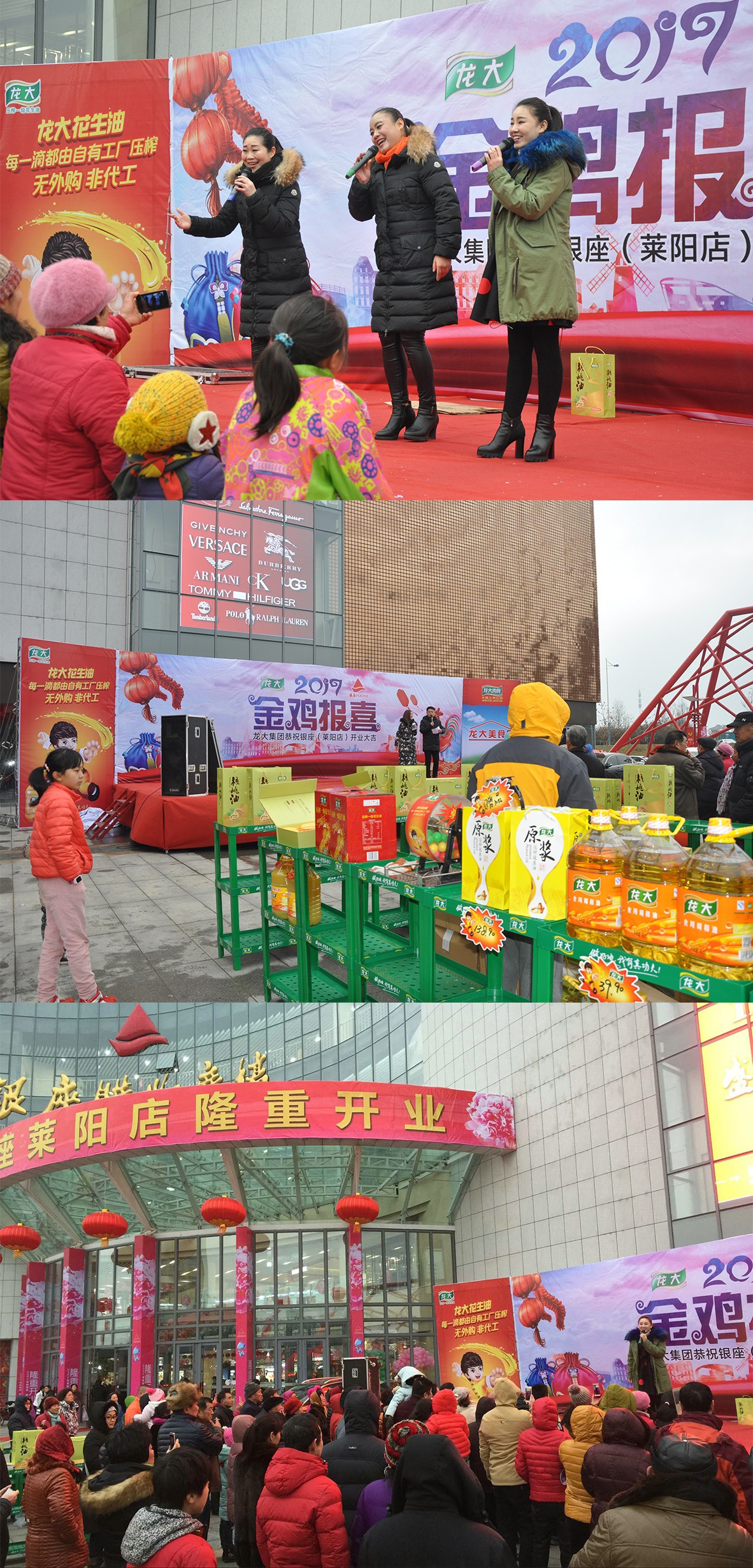 1月7日—9日,銀座萊陽(yáng)店門前廣場(chǎng)喜氣洋洋。龍大集團(tuán)組織旗下植物油、肉食品兩大內(nèi)貿(mào)產(chǎn)品進(jìn)行為期3天的路演,為銀座萊陽(yáng)店開(kāi)業(yè)助力。