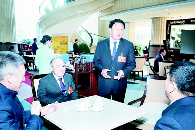 3月12日,李登海(站立者)、宮明杰等山東代表團代表討論有關知識產權保護的話題,認為應把對新品種的保護提升到法律層面,為發展現代種業保駕護航。(轉自《大眾日報》手機客戶端)