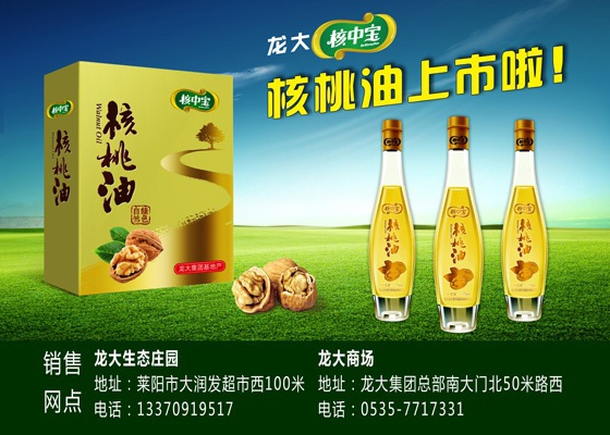 龍大“核中寶”核桃油上市了。核中寶核桃油精選龍大自有基地生產(chǎn)的核中寶核桃,嚴(yán)格按照龍大蔬菜基地“五統(tǒng)一”管理模式進(jìn)行管理、生產(chǎn),綠色、安全、健康、營養(yǎng)。