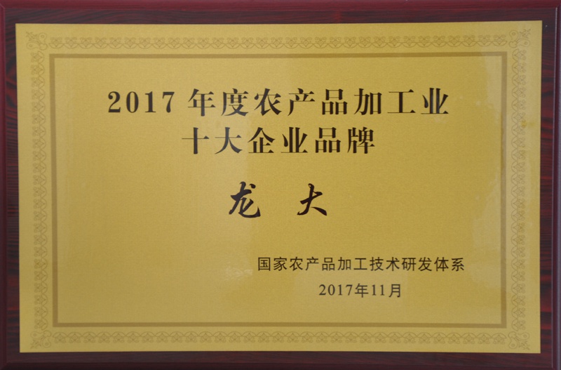 龍大獲評(píng)2017年度農(nóng)產(chǎn)品加工業(yè)十大品牌企業(yè)