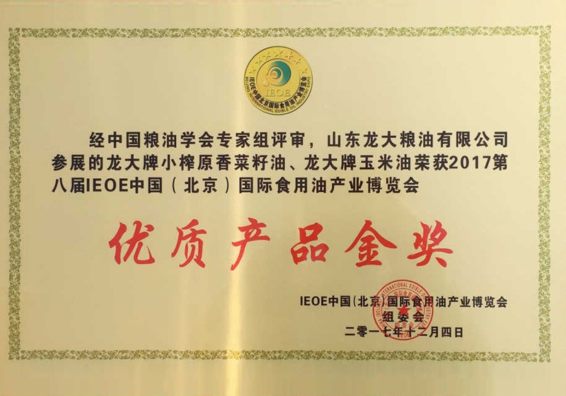 12月4日,第八屆IEOE中國(guó)國(guó)際食用油產(chǎn)業(yè)博覽會(huì)在北京盛大開幕。山東龍大糧油有限公司生產(chǎn)的龍大牌小榨原香菜籽油和龍大牌玉米油憑借過硬的品質(zhì)獲得“優(yōu)質(zhì)產(chǎn)品金獎(jiǎng)”殊榮。
