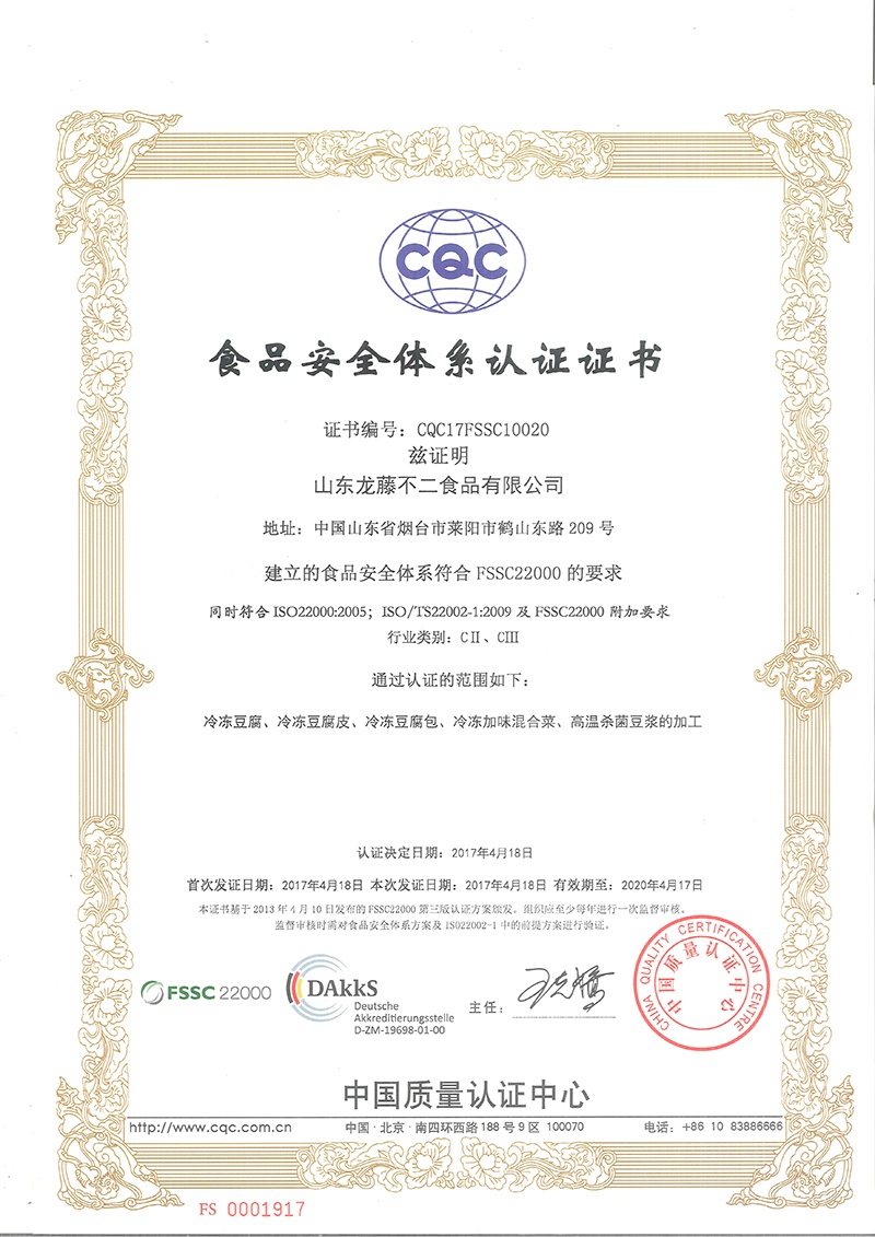 龍?zhí)俨欢就ㄟ^(guò)FSSC22000食品安全體系認(rèn)證